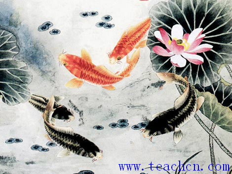 The words for fish and abundance are pronounced the same in Chinese (鱼,yu) so the fish in the Chinese culture symbolizes wealth. Fish also symbolize harmony, marital happiness and reproduction because they multiply rapidly and sometimes swim in pairs. Chinese legend says people placed messages in the bellies of the fish, and thus the fish has come to symbolize communication with a distant friend or loved one. Fish is an important symbol in the Buddhist religion and are among the auspicious signs on the Footprints of Buddha. The fish on the Buddha footprints signifies freedom from all restraints. The most popular fish motif found in Chinese art and culture is that of the Carp or Koi fish. Known to most Westerners as Koi Fish, the Chinese carp has numerous symbolic values within Chinese culture. The carp is a powerful symbol of strength and perseverance. The scales and whiskers of the carp resemble that of a dragon, a great symbol of power in China. At the New Year Festival "lucky money" is given out in red envelopes decorated with a carp and symbols of long life such as peach and pine trees. The word "koi" comes from the Japanese word meaning “carp”. Koi fish have many different colors with the major colors being black, white, red, yellow, and cream colored.