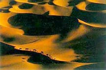 The Great Silk Road is the trading caravan way from China to the capital of Rome empire. It connects two very contrasting worlds - East and West: the two cultures of Asia and Europe. Existed from the 2nd century B.C. till the 16th century A.D. the total length of the route was about 7,000 km. Its name comes from the first item of transit trade - Chinese silk, later beside silk, appeared other goods: jewellery, glass, iron etc. Silk Road has had a unique role in foreign trade and political relations, stretching far beyond the bounds of Asia itself. It has left its mark on the development of civilisations on both sides of the continent. The main route of the Great Silk Road went through the territories of China, basin of Tarim, Over Pamir and Tien-Shan mountains, Central Asia, Afghanistan, Iran, along the eastern shore of Mediterranean and farther to the main trade centres of Near East, North Africa and Europe. The Great Silk Road played a vital role in lifestyle of many nations of Eurasia. It was an important artery in ancient and middle aged time, the source of trade and information, cause of many conflicts and wars. Along the route appeared, reached the golden ages and die many nations and cultures, trade centres and many capitals of world empires. The Han-dynasty Silk Road began at the magnificent capital city of Chang'an (today's Xian). The route took traders westwards into Gansu Province through Lanzhou, Tianshui, Zhangye, jiuquan along the Hexi Corridor reached Jiayuguan - the giant barrier of the Great Wall and the first key point of the route- Dunhuang. Dunhuang is in the west end of the Hexi Corridor of Gansu Province. It is one of the well-known Chinese historical and cultural cities, and the bright pearl on the ancient Silk Road. When the ancient Silk Road came out of the Hexi Corridor into Xinjiang, it broke into three main routes. The southern route ran west along the northern foot of Kunlun Mountains, via Charkhilk ( Ruoqiang), Cherchen ( Quemo), Minfeng ( Niya), and Hetian ( Hotan), then reached Kashgar - another key point on the Silk Road, afterwards went over the Pamirs, and reached India or passed through Afghanistan and Russian Central Asia to reach the coast of the Mediterranean or Arabia. The central route meandered west along the southern foot of the Tianshan Mountains dotted by Loulan, Korla, Chucha, and Aksu, then crossed the Pamirs and led to Mari in Russia. The northern route rambled along the northern foot of the Tianshan Mountains, starting at Hami wound through Turpan, Urumqi, westward reached the Ili River Valley, and led to area as near the Black Sea. The ancient Silk Road in Xinjiang traversed desolate desert areas and wound over snow-capped peaks. It was full of difficulties and obstacles and more dangerous and fascinating than other sections of the road. It was the only way for China to get in touch with the West between the second century B.C. and the 10th century A.D. Various ancient cultures of the West and East, including some lost cultures, have left traces of themselves in Xinjiang. Although sections of the Silk Road have been buried by sand in deserts, the local dry climate has miraculously preserved sites and relics several thousand years old. Some relics are as good as they were centuries ago. The three routes of the Silk Road ran between mountain ranges and long edges of deserts, going through oases inhabited by ancient tribes. These tribes also opened some branch roads across mountain passes to join the three routes together. Many caravan routes on the Great Silk Road were changed by time, and only the main directions from the East to the West and back were kept originally.Caravan traffic was very slow, in good day the caravan consisted from 100 to 10 thousand camels covered 8 farsah (50 km), in nasty days - 4 forsah (25 km). Along the route the one could take a rest in Caravanserais. The Great Silk Road promoted the transition to settled style of life, and developing of animal breeding. There were no similar phenomenons in the history of humanity with the same economical and cultural importance. The Great Silk Road put the Order, Commonwealth and Peace in general chaos of the Middle Ages. |