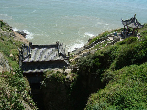 Fanyin Cave 梵音洞 , which means the cave of Sanskrit sound is located at the easternmost of Mount Putuo. The two walls of its entrance are cliffy and opposite each other, about 70 meter high and 50 meter deep inwards. There is a huge natural rock spanning over the cliff like a huge stone bridge. Upon the bridge is a building called Guanfo Pavilion. Walking from the cliff top down along the cliff stairs more than 200 steps, one can reach it, seeing the sea forward in bird's view and taking a lookup at the cave backward. With a little imagination you can see Guanyin in the formation of the rocks.