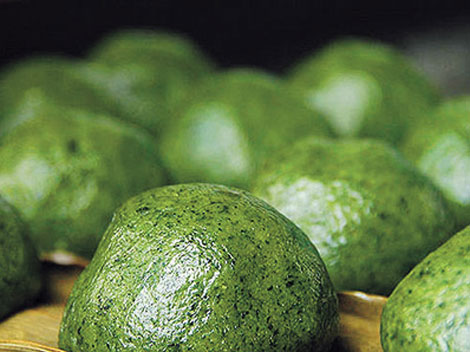 The green juice is then mixed with glutinous rice to make dough, which is stuffed with a filling.