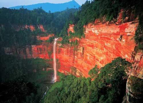 Danxia Mountain hides in the green forests. With clean waters around, the red stone peaks are erected to the sky. The huge red cliffs are gorgeous and in various shapes. Some of them are like the running animals, some are like old person, vivid and true to life. The waterfalls are falling down in the valley, like the net hanging in the woods as well as the curtain on the red rocks. The deep valley, the zigzag streams, the different peaks and rocks, and the mystical caves make this area a valley showplace (xiá gǔ dà guān yuán 峡谷大观园).