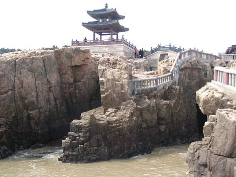 Chaoyin (The Sound of the Wave) Cave 潮音洞 is situated in front of the Purple Bamboo Forest, on the seaside. It is not a real cave but a huge vertical gash in the cliff face. Day and night you can hear the thundering sound of the tide. During the reign of emperor Kangxi (1662-1722) its name was written on one side of the cave.