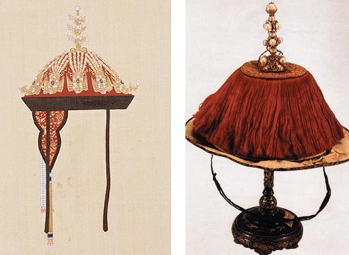 Winter court hats of empress dowagers and empresses were made of fumed marten and sewn with red wefts. Their hats adorned with pearl, gold pheasant patterns, gems and jade ornaments had protective collar behind the neck with drooping bright yellow ribbons. Summer court hats were made of cyan velvet.