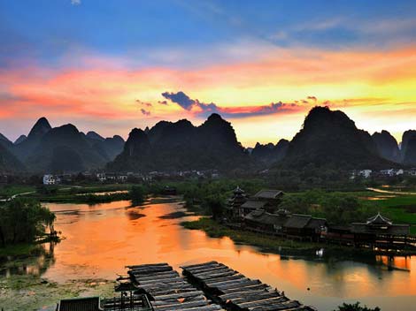 Yangshuo (阳朔; Yáng shuò) is a very scenic, small county and city surrounded by many karst mountains and beautiful scenery near Guilin, Guangxi. It is very popular among tourists.