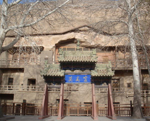 The Mogao Caves or Mogao Grottoes (mò gāo kū 莫高窟), also known as the Caves of the Thousand Buddhas (qiān fó dòng 千佛洞), form a system of 492 temples 25 km southeast of the center of Dunhuang, an oasis strategically located at a religious and cultural crossroads on the Silk Road, in Gansu province, China. The caves may also be known as the Dunhuang Caves, however, this term also include other Buddhist cave sites in the Dunhuang area, such as the Western Thousand Buddha Caves, and the Yulin Caves (yú lín kū 榆林窟) farther away.