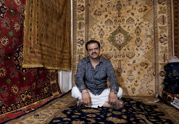 An exhibitor from Afghanistan is surrounded by his exhibits—handmade carpets— at the second China-Euroasia Expo on Sept 4, 2012, in Urumqi, Xinjiang Uygur autonomous region