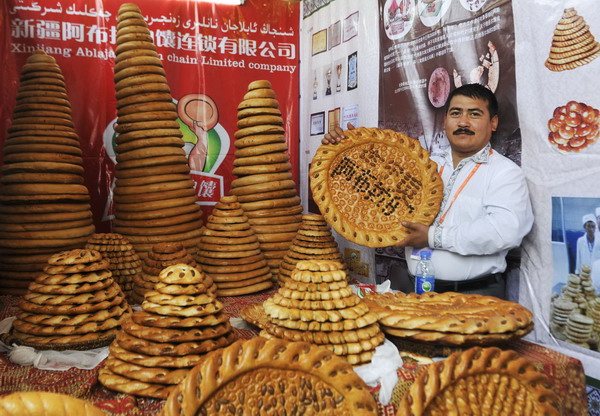 A local exhibitor displays Nang, a kind of popular pancake that is a staple food for Xinjiang's Muslims, during the second China-Euroasia Expo on Sept 3, 2012 in Urumqi, Xinjiang Uygur autonomous region.