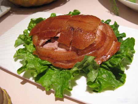Peking Duck, also known as Peking Roast Duck, is considered to be one of China's national dishes. To prepare for the dish, ducks are bred specially for this dish and slaughtered after 65 days. Before roasting the duck in a closed or open oven using the wood of fruit trees, the duck is seasoned so that the flavor is absorbed into the meat. Usually, Peking Duck is eaten with pancakes, spring onions and sweet bean sauce.