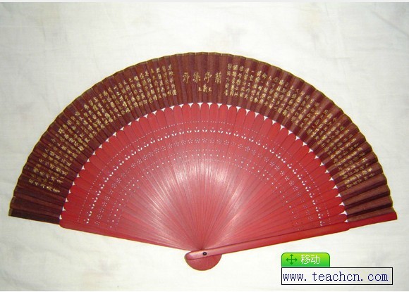 Sandalwood fans are one kind of folding fan, but the bones of the fans are made of sandalwood, which began in China. The patterns can vary, such as "Pulling Flowers", "Pyrograph", "Drawing", which are its unique features. Pulling Flowers is to pull the thread to form bare flowers. For example, the work of "the Goddess Gives out the Flowers", which has more than 15,000 eyelets, is exquisitely carved and fine. Pyrograph is to draw with a stylus on the sandalwood without any draft. Drawing is to use a brush pen on the silk. The sandalwood fans made in Suzhou are preferred by people both inside and outside of China.