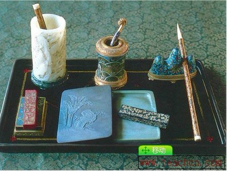 The four treasures of the study, is a general name of the main traditional writing tools of Chinese calligraphy, i.e. writing brush, ink, ink stone, and paper. The use of brush dates back to 4000-5000 years ago in China; ink came into being 3000 years ago; the paper was invented in the Eastern Han Dynasty; and the ink stone was invented in the Spring and Autumn Period.